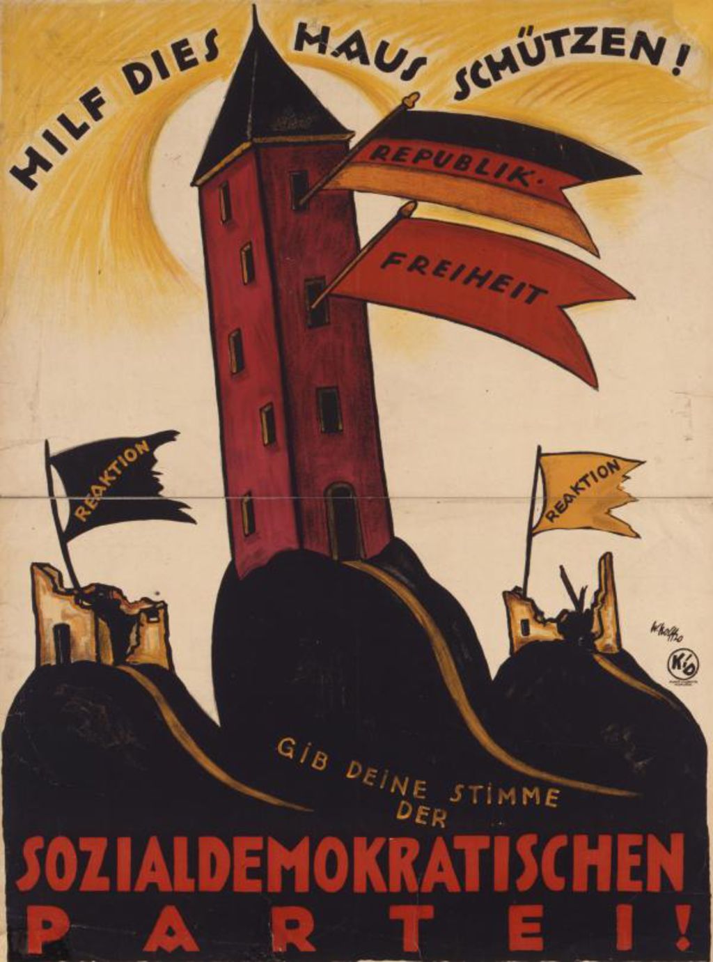 The flag of the united Germany in 1871 was the black-white-red tricolor with a more complicated war flag used by some military units such as ships. The imperial tricolor was something of an afterthought for the unified Germany; it originated during the earlier North German Confederation to fulfill a need for a unified ensign for German ships. The flag itself was neither a Hohenzollern nor a Prussian one, although it did incorporate some of their traditional colors. Yet the flag was indelibly associated with Imperial Germany and its lost war. A number of Germans in November 1918 instead opted for the black-red-gold tricolor. These were the colors of the German volunteers in the war against Napoleon and emerged in the post-1815 period as the colors that symbolized a united Germany. The Paulskirche parliament and other 1848ers tended to use the black-red-gold over the red flag as the symbol of their movement, seen here quite vividly in the Germania portrait that presided over the Paulskirche parliament as seen in this lithograph. The failure of the 1848 Revolution in Germany though was not the end of black-red-gold and after 1918, it became the new national flag of Germany. Not only was black-red-gold a break from Prussia and the Hohenzollerns, it was also reaching back to a past German democratic tradition. The SPD, Ebert in particular, invested a degree of effort into making 1848 and its black-red-gold as a historical origin for the Weimar Republic. The red flag did not disappear from the Weimar SPD, but was often coeval with the black-red-gold, such as in this 1920 election SPD poster.